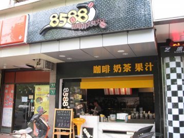 8588咖啡烘焙家的杯子很好玩,白色的杯子底色上面写这都是数字8588,蛮有趣的,门面不大,但是非常的干净,他家的品种还蛮多的,有各类咖啡、奶茶、果汁,价格比较实惠,买了杯原味奶茶,5米,奶茶的口感有点偏淡,奶味比较偏重一些,珍珠蛮多的,甜甜的QQ的口感不错,总体感觉一般。