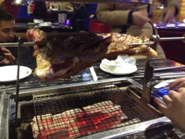 烤串店,就在马连洼北路,他家的卖点就是音乐表演,尤其是夏天的晚上,我们8点来的,店里还是人很多,好在不用等位了。其实有音乐助兴就是图个气氛好。4人来吃,点了一只烤羊腿,这个肉很嫩,自己烤也好玩,就是等的时候基本长,所以又点了鱿鱼、烤韭菜那些,烤韭菜最好吃了,点了2份,上面刷了烤肉酱,味道不错,有嚼头。鱿鱼很特别嫩,身子上的肉挺厚的,有嚼头。边吃边烤羊腿,4斤的羊腿肉就是足实,自己根据需要添加佐料,也算客串了一把烤肉师傅。人均85元。…查看更多