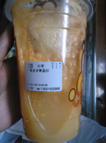 C多多 这家水果鲜榨的饮料小铺子,买了芒果多多寒晶冻,冰块的所以夏天喝起来很爽口,芒果是一直很爱的,这家芒果果肉放得很多哦,味道非常浓郁可口,寒晶不知道是什么东西,吃起来很q的,味道是淡淡的,属于辅料吧。