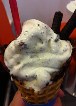 以前老吃DQ的暴风雪系列,这次换换口味,巧克力蛋筒冰淇淋,味道还不错。冰淇淋的口味是朗姆酒风味的,酒的味道倒不是很浓,但冰淇淋的口感很细腻,奶味儿比较浓郁,还有一点淡淡的香草味儿。上面插了两根巧克力棒,脆脆的,很好吃。蛋筒的口感也很脆,包了一层巧克力的边,味道不是很甜,还算比较清爽吧。查看更多
