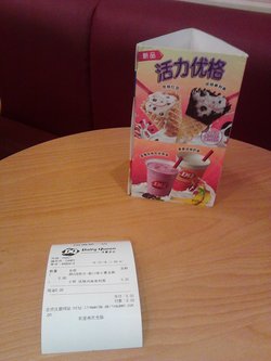 招商银行信用卡九积分兑换的,很热门的一款商品哦,下手要快。跑去普陀巴黎春天的DQ,顺利验证完,新口味有两款:优格奥利奥和优格红豆。 我选了优格奥利奥,DQ的冰淇淋现在做得清汤寡水的,化得快,木有冰淇淋的醇厚。优格口味有点小甜,奥利奥的点缀还不错。 店员服务态度不错哦,店铺面积不大,可能上午的关系,没啥客人。
