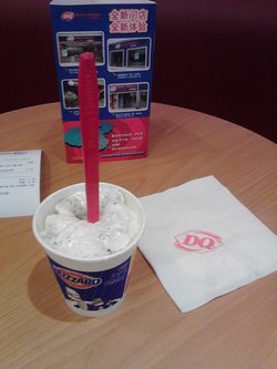 我还是比较钟爱DQ的暴风雪系列,尤其对奥利奥口味的情有独钟~奥利奥口味的冰激凌,它家算是做得最好的~奥利奥本身还带有一些饼干的感觉,而配上冰爽的冰激凌,甜脆中带有舒爽~冰激凌的整体口味蛮甜的~奶香味很浓,入口后浓浓的香味配合奥利奥的巧克力香味,很是美味~而回味中带有奶香,而且不是很腻口,还是比较爽口的~很喜欢~!