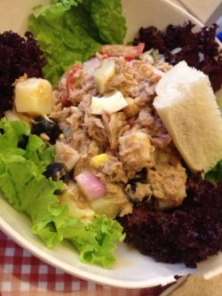 去了大同花园的ME & JOE ,点了金枪鱼色拉43元,小贵,金枪鱼放的很多的,有丰富的生菜,面包粒,小橄榄等,蛮清爽的,吃起来感觉挺营养的,鸡肉芦笋香草意面 ¥50,绿色的,香草味道浓郁,蘑菇软软的,意面煮的刚刚好,感觉每个菜怎么都会有半片面包呢?算是特色吗?好吧味道还不错的。查看更多