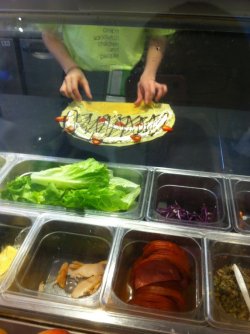 店面不大,感觉很清新。白墙上面点缀着淡绿色的花纹。六张小圆桌和配的椅子都是浅浅的木色。灯光较明亮,显得环境干净整洁。店员也穿粉绿色制服,柜台里是一些色彩缤纷的水果做装饰。主打日式可丽饼和潜艇三明治。还有水果茶和其它饮品。点套餐即主食加饮料,可以便宜几元。不过中午饭点,一般客人都要的是三明治。选了一份鸡蛋潜艇三明治。与赛百味不一样,好象不能自主选择配料。一个老兄硬把这里当成赛百味,一会要选面包,一会是调味酱,一会是配料,可惜无一满足。面包胚上面可能洒了五香粉,带着点咸味和香料味。6寸长,加热过,口感很好,非常松软。馅料里加了鸡蛋、洋葱、西兰花、青椒和生菜。味道较为清爽。三明治很不错,比赛百味的好吃。…查看更多