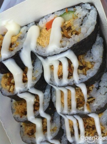 简便快捷的花样寿司,品种还蛮多的,现做现拿,非常方便也新鲜,整体不错,价格也适中。招牌寿司:里面是肉松和脆脆的类似锅巴样的东西,吃起来很脆很爽口,还有萝卜黄瓜等配料,外面的海苔很多,上面还撒有木鱼粉和色拉酱,吃起来咸甜口感交叉,很不错。