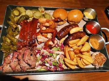 烟熏伊比利亚黑猪肋排 / 烟熏低温慢烤牛胸肉 / 手撕烟熏猪肉小汉堡 / 大汉堡 / 墨西哥玉米脆片配番茄莎莎 / 机械手炒脆章鱼