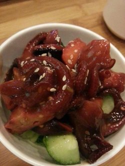 带小孩子去中山公园玩,午饭就在西园这边解决了,话说这边的交通实在是个大问题,找位子停车都花了好半天。这家韩式料理店就在一楼挺好找的,环境还行装修挺简单的,特别是硬质桌椅让其中一位胖子朋友大呼受不了。点了麻辣锅和芝士年糕锅,其实份量都不多,适合女孩子吃。麻辣锅看着都觉得辣,汤汁红艳艳再加上满满的辣椒壳,都醉了。锅里面有我最喜欢的冻豆腐,还有肥肥短短的香肠头,弹性十足味道也很鲜美,冻豆腐特别吸味道,一咬开汤汁会喷到嘴里,很烫很辣特别爽。香菇蛮肥厚,肉肉的口感。拉面不是蛮经煮,稍稍烫煮一会儿就可以吃了,面条很有弹性,滋溜溜就能吸到嘴里,总觉得要像韩剧里面那样吃才香,呵呵。芝士海鲜年糕锅花样不少,芝士年糕条、八爪鱼、鹌鹑蛋、饺子、花枝、蟹柳和虾,再加上泡菜洋葱打底,随着热气腾腾,一股香味扑鼻而来。年糕条里面裹着芝士,要开后芝士会流出来,黏糯又磁,口感很不错。稍稍觉得腻了,可以吃点泡菜开胃得很。饺子是经过油炸的,里面的馅子和中式有很大区别,泡在汤里面吃倒是香辣可口。花枝味道一般,不怎么入味,吃起来很有弹性,虾子很大一颗,肉质还算鲜甜。点了份蜜汁八爪鱼,小小的翻成一朵花样子,再加上蜜汁和白芝麻,特别富有光泽,八爪鱼味道很不错,甜又富有弹性,就是份量太少,下面是用黄瓜打底,实际的八爪鱼就几个,性价比低。韩式泡菜给的不少,味道酸酸辣辣的,很开胃很适合配米饭吃。