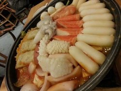 这个店的名字蛮奇特的,进去才发现就是韩式火锅,店里人气挺旺的,还等了会位置~招牌的菜式是芝士海鲜年糕锅和泡菜牛肉锅,我们选了芝士锅,锅不大,但是满满的好多种东西,有年糕,牛肉卷,海带,海鲜丸子,金针菇,辛拉面等等,看起来蛮像大杂烩倒是,年糕味道还行,里面夹的芝士,蛮有风味,但是吃多了以后有些腻,毕竟属于比较甜的那种。。。而且整个锅都很清淡,对我们这种重口味的来说只能尝个鲜就行了~~其他的还点了话梅花生,鲜果塔塔和波子汽水,不得不说下鲜果塔塔,就是薯片上面放点水果嘛,其实自己在家就能做。。。波子汽水不要点了,15快一瓶,好贵,味道也就那样,总之去吃了试试就好~