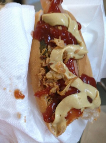 SunFlour 这家店吃下午茶的白领还是挺多的,我们买了个面包带走吃吃,有点像是三明治的做法,一个大面包里面夹了火腿肠,淋上番茄酱和沙拉酱,还有脆脆的黄瓜片和炸洋葱,滋味不错。