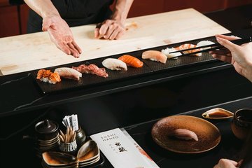大满足鹅肝手卷 / 海胆寿司 / 和牛寿司 / 三文鱼 / 左口鱼裙边寿司 / 金枪鱼大腩寿司