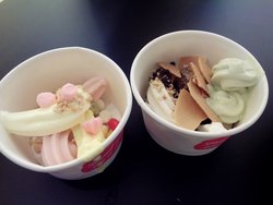 自助式的酸奶冰淇淋,挺新奇的,又好玩又好吃,可以选择自己喜欢的口味。其实吧,不是因为自己DIY的,也说不上有多好吃,酸奶味的冰淇淋,一般我自己也不太会去买。就因为自助式的,自己挤冰激凌感觉超爽的。辅料我加了一点水果,有芒果啊,奇异果啊之类的,水果很新鲜,感觉酸奶和水果特别的搭。酸奶冰淇淋的口感挺顺滑的,原味的不会很甜,又是低脂的,完全不用怕胖。