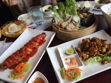 蓝色港湾里有很多好吃的,而且这里环境也不错,常带孩子来玩,这家餐厅是越南菜馆,环境简约而大气,很有特色,做的菜也比较精致。炸春卷特别好吃,口感很酥,而且不油腻,非常香。咖喱鸡拌米饭很香,感觉越南菜和泰国菜很相近。价格偏贵,3口人消费将近300元。