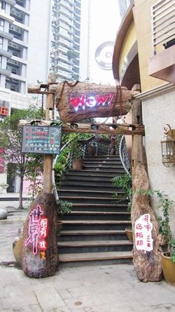 开在九眼桥附近,新开不久,开张很优惠去的。WOW的装修很自然,楼下楼梯口两根大树桩子,上面还吊起好大一根木头哦,还用链子缠绕起来,看起很有风情的一个西餐酒吧顺梯而上,到达wow 西餐吧进门后感觉整个酒吧呈现出一种很自然很狂野的装修风格,随意搭配的车轮、原木桌椅、木条、马灯、涂鸦墙、各种麻布等等,混乱搭配在一起却又很自然很和谐wow 西餐吧,提供美味牛排、披萨、汉堡、薯条、咖啡、各种酒水畅饮套餐等配上优美乡村音乐,免费wifi,你可以在这儿发呆,也可以朋友三四的闲聊,可以情侣相聚,也可以家人来玩香辣牛肉比萨SpicyBeefPizza 现烤的,味道不说特别巴适,也很实在,分量很足的土豆条加青岛啤酒,边吃边聊服务也不错的…查看更多