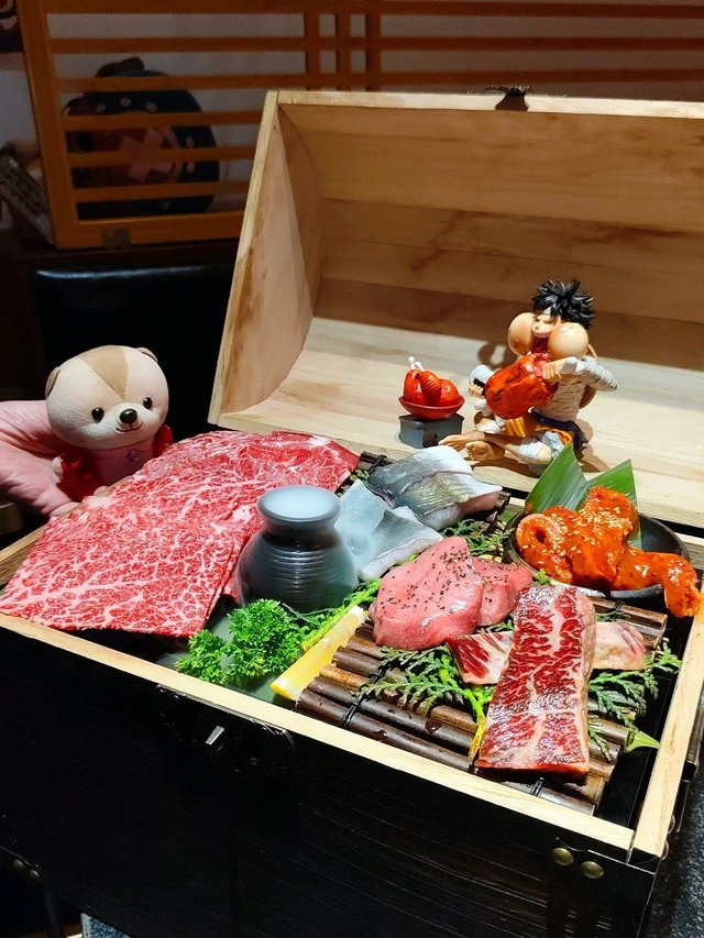 打開寶盒一陣仙境迎來,當然要打卡一下📸。肉肉包括和牛M9板腱、和牛M9+上腦、牛舌、極上隔膜、極上肋條条及炭烤活鰻 。