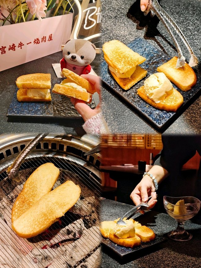 烤麵包有冰火交融的口感,用炭火烤到金黃色,再切件加入冰淇淋,吃起來這個口感絕了!
