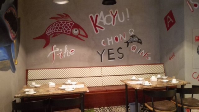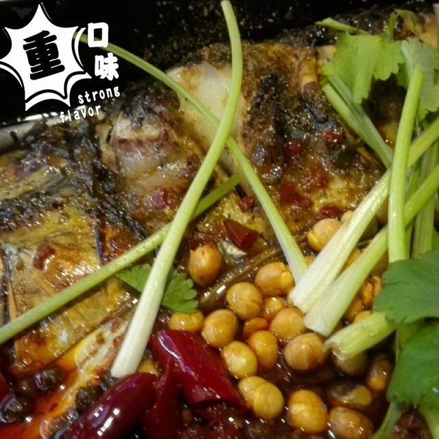 三斤左右的草鱼一剖两开放在烤盘里,鱼肉很厚,只是不入味。其实味道可以有九种口味选,服务生说麻辣和香辣,是他家的招牌口味,于是点了香辣,可惜这味道。