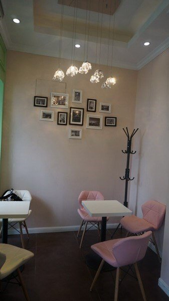 店铺的一边是富有英伦感觉的迷你就餐环境。辣妈好喜欢照片墙和粉色的椅子很有学生时代的感觉哦!