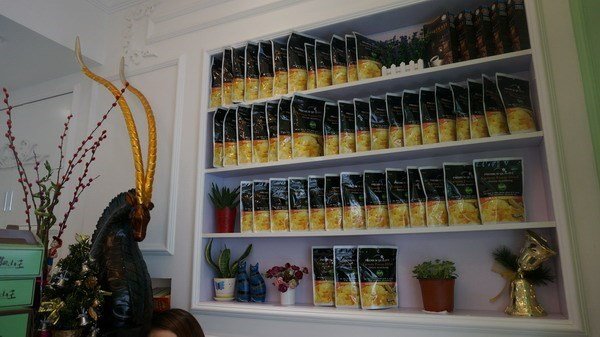 货柜墙上是可以带回家品尝的各种马来西亚榴莲干。一边带有金色尖角的骏马头像也是一个抢眼的装饰物,不知道有什么特定的含义哇!