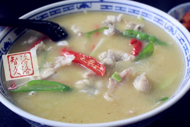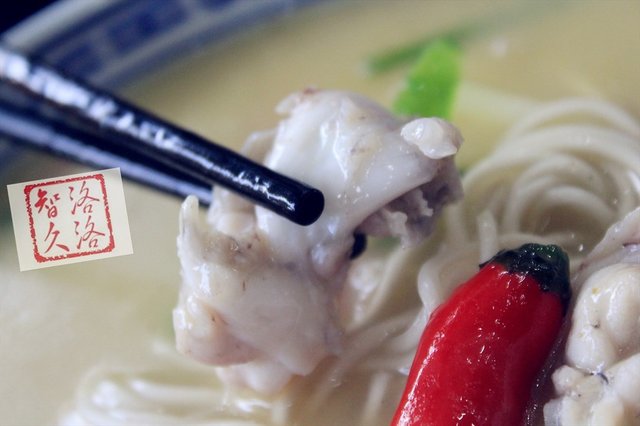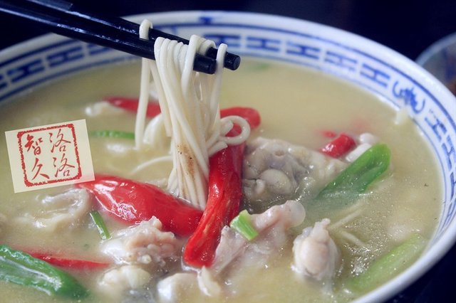 洛品嘗的是牛蛙面,牛蛙的份量還算是實在,牛蛙肉也蠻緊實的,只是湯頭不太靈光,麵條的吃口也一般般~他們家用的碗倒是很複古,很大的瓷碗,份量倒算是實在~只是勾芡略欠火候,覺得湯頭略有些糊糊的感覺,湯頭不靈光~
