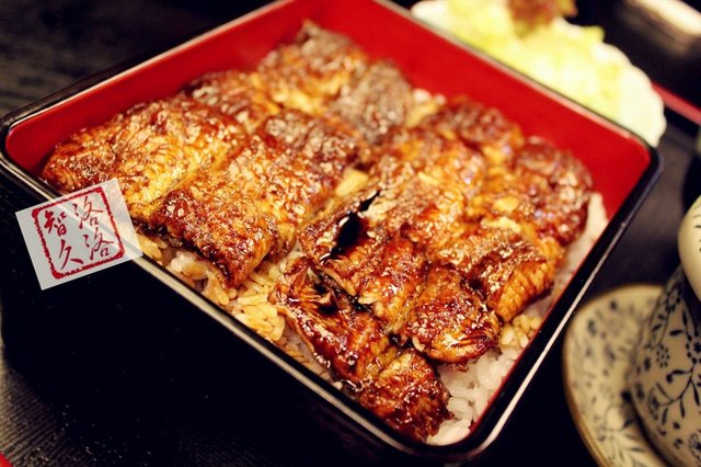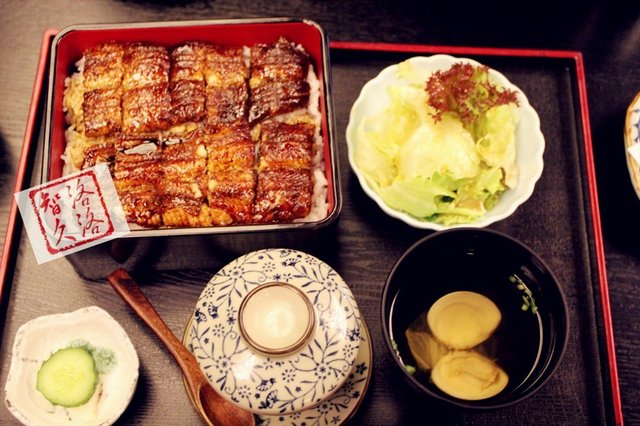鳗重大份,185元/份,兩個人share,因為鰻魚是現烤的,口感稍許有些焦焦的,但魚皮很香脆,老闆建議澆上一些鰻魚汁,這樣口感更鹹鮮些,他們家鰻魚的確厚實,份量實在味道還不錯,套餐內也附有蔬菜色拉、味增汤、茶碗蒸~