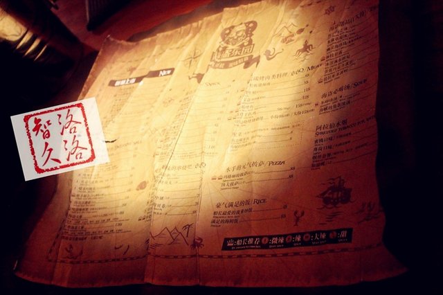 翻看他們家的MENU,很有新意的,製作成羊皮卷,略有些殘舊,令人瞬間有種穿越的感覺~仿佛打開藏寶圖一般!很有創意!