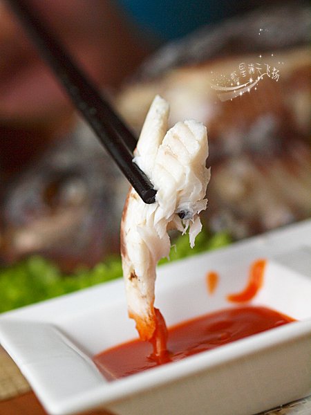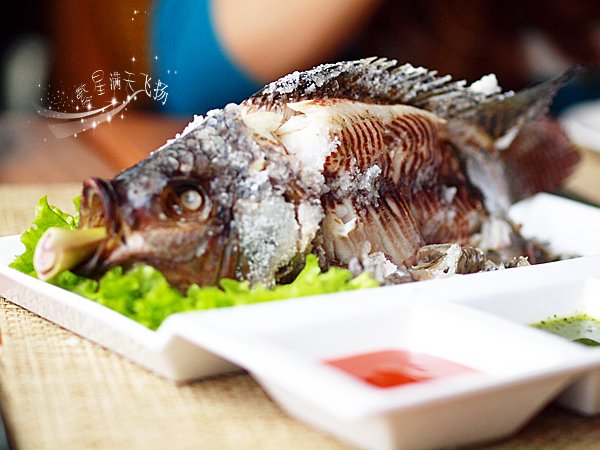相貌丑陋的罗非鱼,口含香茅怒瞪双眼,周身涂满海盐,整条游满盆中,四目对视竟然读出了它的临危不惧,看着它皮肉飞溅,这45分钟的漫长烤制真心难熬,闻着那扑鼻的香,我都不忍开筷去支离它。拨开盐巴,颤抖地夹起那洁白如雪的鱼肉,入口的娇嫩鲜滑,便在口中蔓延开来,这稍显重口的咸味,如同大海的味道,夹杂着香茅的清新气息,将这海之味纯天然奉献。