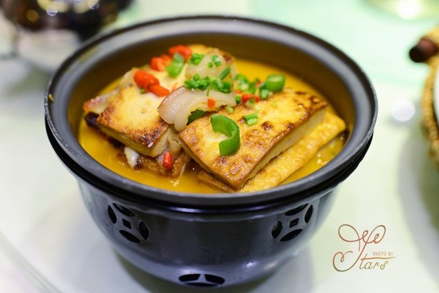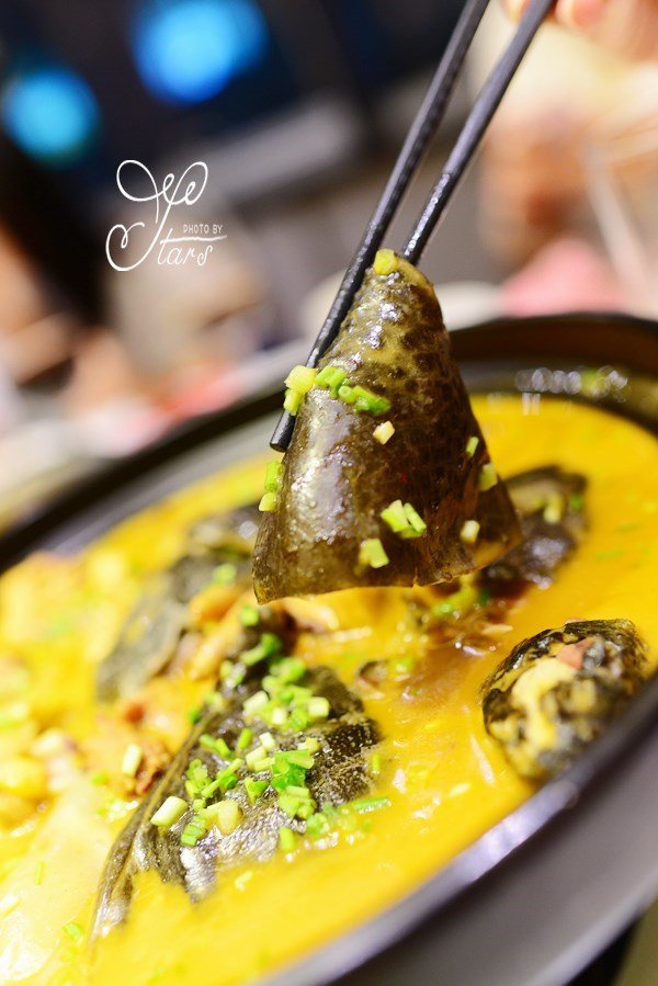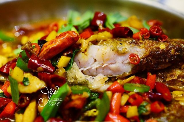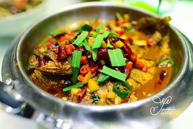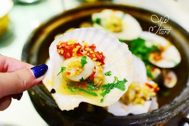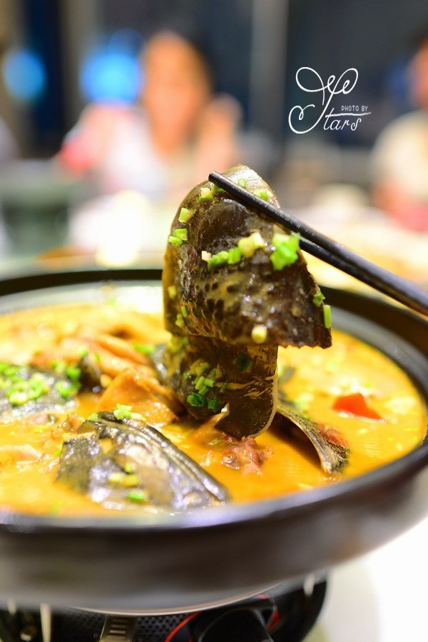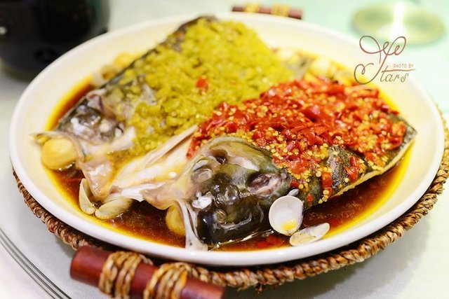 花鲢鱼头开切两瓣,青红双椒各淹一头,却依然无法掩饰大鱼头的银闪娇柔,上桌时的椒香四溢。只草草定格下它的英容帅影,便已起筷直挖鱼头之七寸要害,鱼脸肉大片而肥厚,鲜嫩得透着嫩粉,刚入口便直滑喉底,这来自洞庭湖的鱼头王,果然不仅肉质鲜嫩肥美,还不见一丝的土腥,连细刺中的鱼身肉也是绵滑细腻,怎一个鲜字了得,里内配备的鱼丸、贝类更是鲜上见鲜。