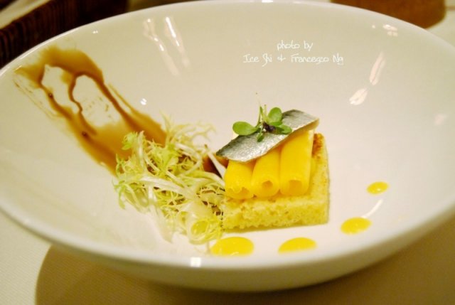 餐前还送了一个小菜,是面包上面放了鱼块,然后再放了芒果类的东西,这个完全不喜欢的。味道蛮腥的。