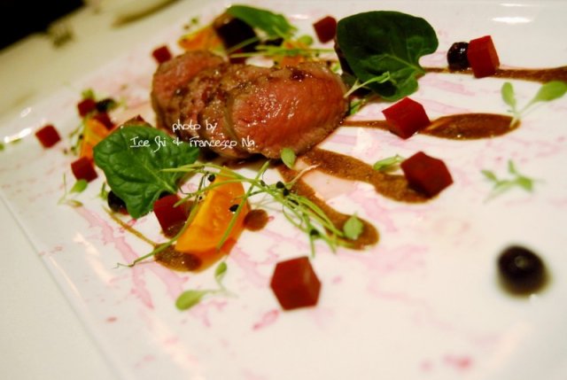 蜂蜜烤羊肉配里奥哈红葡萄酒球及甜菜头:这个羊肉做的是很生的,有很多血丝,肉非常得嫩,烤得火候撑握得也很好,不过也是量太小了啊。
