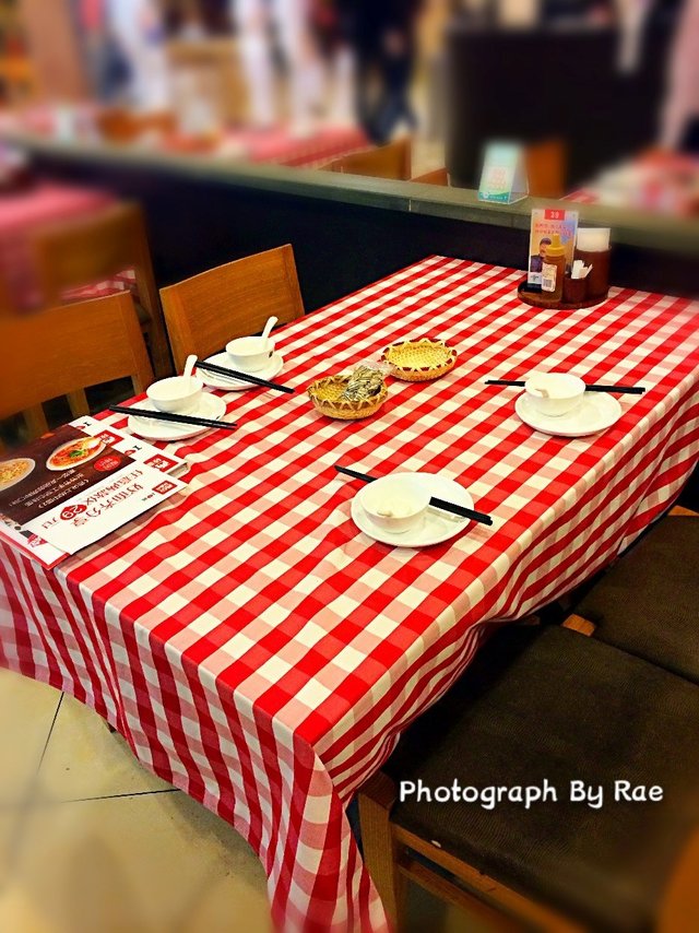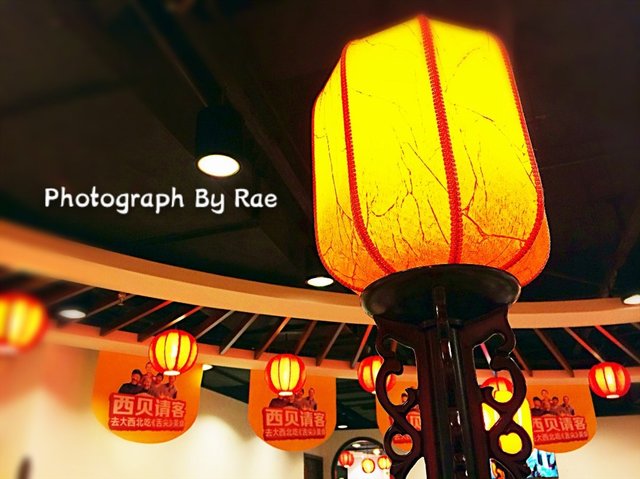 店内环境很喜庆,晕黄的灯笼还有红白相间的桌布