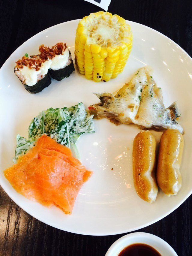 三文鱼是烟熏的,不是很喜欢吃,别的海鲜没敢拿,主要是我太馋三文鱼了啦。