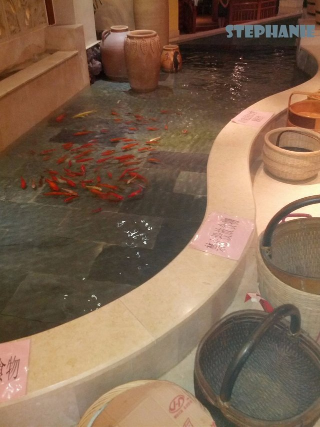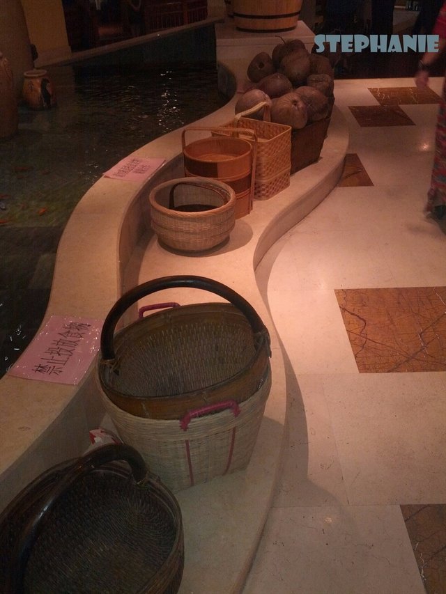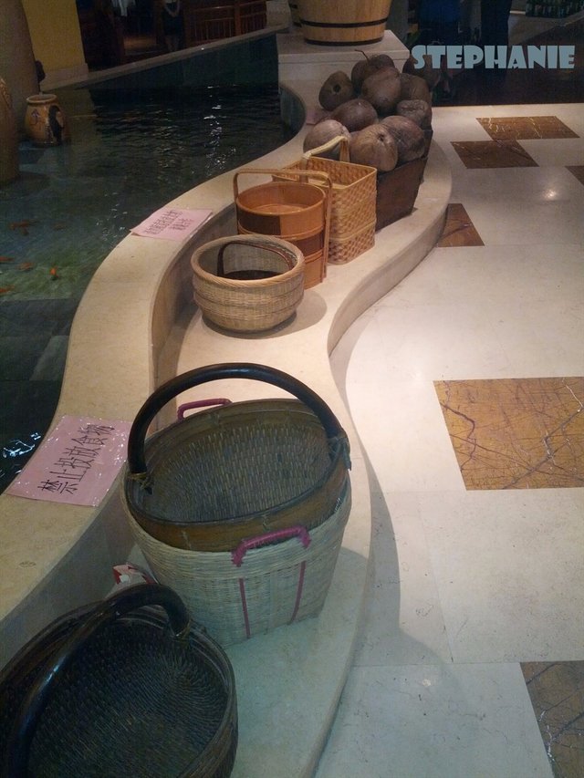 大厅里面的鱼池,里面游动着些可爱的小金鱼。池子里面放些些坛坛罐罐,池子旁边有些竹篮竹盒,有点东南亚的感觉。