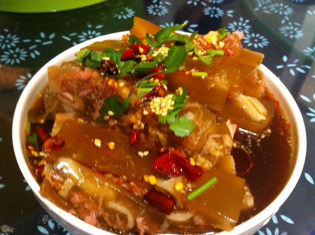 【小姨子皮冻】冰凉爽滑,富含胶原蛋白的皮冻,美味又养颜。撒上辣椒、葱花滋味更足。皮冻是真正用猪皮熬制的,所以如果不尽快食用随着温度升高皮冻就化掉了,足以验证真材实料。有的皮冻不论怎么放都Q弹不变可能放了什么东西呢。