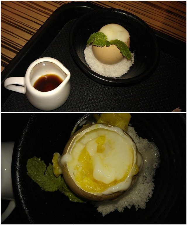 以前吃过分子料理,特别着迷于食物奇异的形态,尝到味道的一瞬间总是有惊喜。至于分子鸡蛋料理,在很多地方吃过芒果风味的,很惊艳,也吃过蛋清外表实为酸奶的创新。本来对一甜壹鲜的印象不错,对分子鸡蛋也抱有一定期待,不过尝了之后却大所失望,就是没有熟的蛋,当然其实是已经熟了的,只是加热的方式比较创新,所以鸡蛋是液态给人一种没有煮熟的感觉,鸡蛋还配有一点盐,表层浇了一点酱油,总体感觉非常一般。
