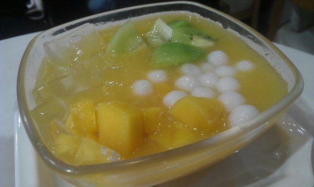 杂果小丸子,貌似也是24米。配料基本和上一道没区别,芒果、猕猴桃、蒟蒻,加了点糯米小丸子而已。芒果汁不会特别甜,还不错,稠稠的喝起来很爽口。水果依旧很酸~