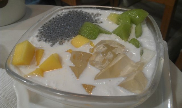 白雪黑珍珠,24米。小伙伴的必点餐,呜哈哈。冒实在受不了兰香子的状态和口感,密集恐惧症伤不起。挑着吃了点芒果和猕猴桃,怎一个酸字了得,好在还有奶汁,搅拌一下还是可以接受的。蒟蒻放的很多,QQ的还不错。