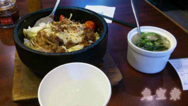 石锅拌饭点的是芝士牛肉,我喜欢芝士,但是这个芝士的量拌在饭里就完全感觉不到了好吧~这个吃口就像是石锅拌饭中的煲仔饭,煲仔饭中的石锅拌饭啊!拌的不是通常拌饭里的蔬菜,他的蔬菜是M汉堡里的蔬菜啊,一勺舀起来的味道就是M记啊!这点实在接受不了,你放西葫芦啊,胡萝卜啊我都可以接受,这种蔬菜色拉的材料有点奇怪了!