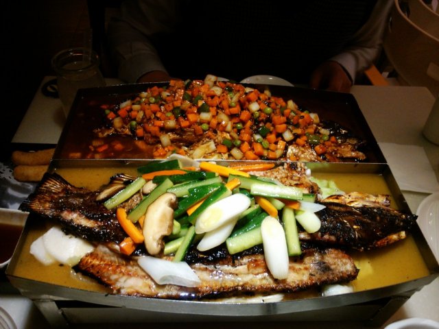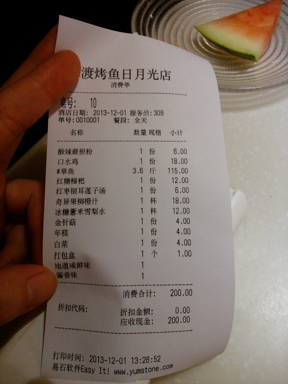 点评团购了代金券,25买50的,团了4张。看了点评的评价不错,也是新开的店,所以果断的要去尝试下,临近过期就昨天和朋友两个人一起去吃了~因为一些原因不能吃辣,所以点了两种口味都是不辣的,一种是酱香,一种是鲜香。有18种口味可以双拼自己选择。鱼也可以自己选择的,我们要了最便宜的草鱼。 想要两斤鱼的,告知最轻的鱼也要三斤左右,那就3斤多点吧~~烤鱼里面可以加配菜的,4元一份,大概150G左右~~还点了两个凉菜,一个红糖糍耙,一杯银耳羹两杯果汁~然后凑足了200元整~~