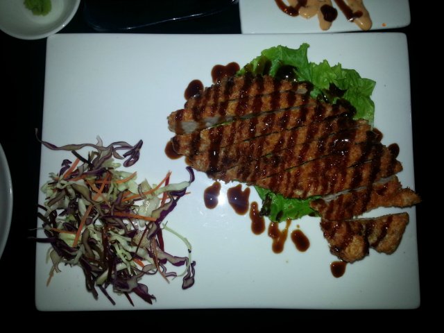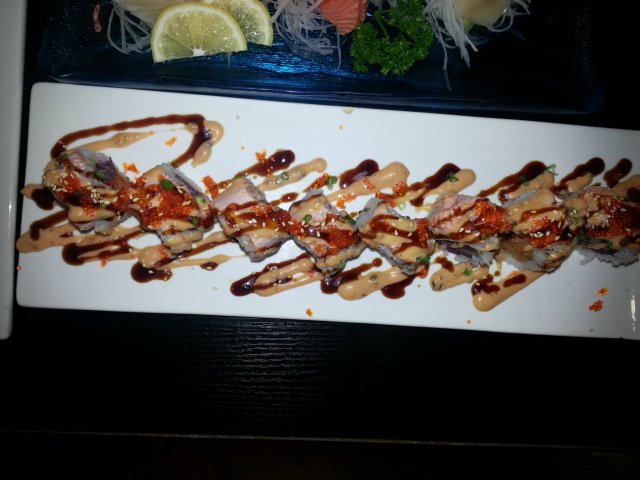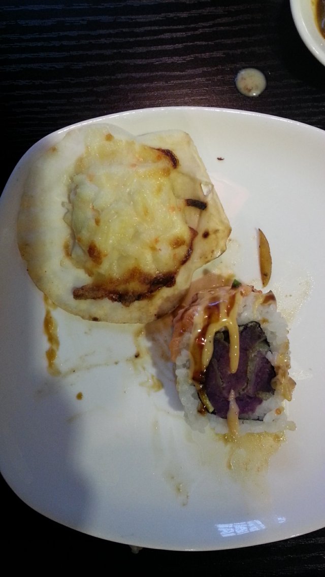 第三个是飞跃帝国的寿司盘,这个好棒,以前一直看微博上大家说好吃,没想到真的很棒,酱很浓,最主要的里面包着紫薯和山芋,好糯而且甜甜的,味道很独特。现在想想还是很想念。后面的上菜很快,煎烤青鱼鱼肉很厚,但是有点腥味。焗扇贝,一口吃了,没有感觉,奶油不腻,这点不错。