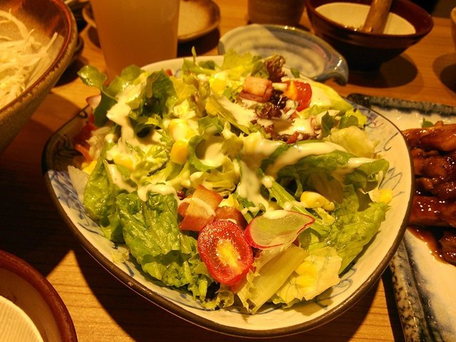 【沙拉】要一般些,有蔬菜,圣女果,玉米粒,沙拉是奶白的沙拉,给的很厚。
