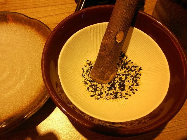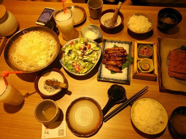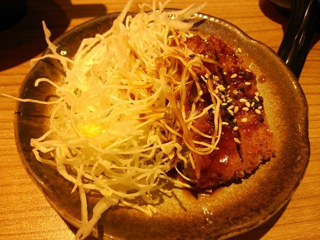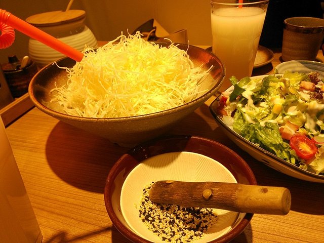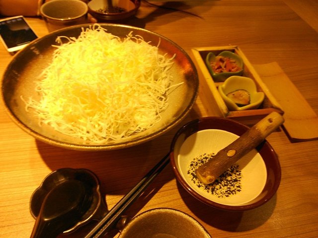 他家比较有特色的是各种吃法,刚开始还真记不住,要先把芝麻自己用木棍研磨碎了,这个说实话很有意思,不过也有些费事,高丽菜可以加各种调料,加上猪排之类的,店员一般会告诉你怎么吃。