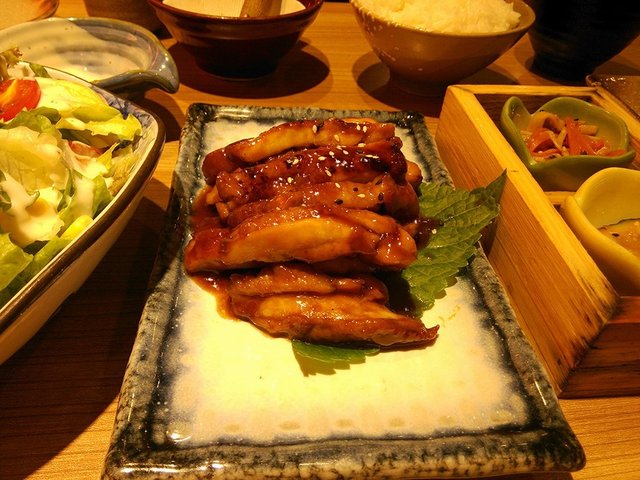 【照烧鸡】有一层汤汁在外面,金黄色,撒的黑白芝麻,看上去很有食欲,味道微有甜味,很好吃。