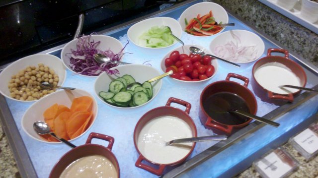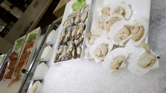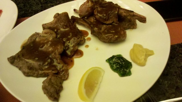 热菜方面只能说选择性不算很多,有披萨、鸡肉、龙利鱼之后就是烤羊排、牛排和烤鱼,不过和以前不同的是现在他们家都是事先烤好的羊排牛排,不像以前是现点现烤的,不过烧烤的配料变多了有蘑菇酱、黑胡椒酱、还有薄荷酱和黑橄榄,倒是在搭配上变的有点新奇。吃下来发现他们家的牛排虽然切的薄不过烤的有点过,吃上去很老配上黑胡椒酱只能勉强吞咽,倒是羊肉肥瘦适宜,肉质鲜美不用蘸任何酱汁就能吃出那种原汁原味的味道,一不小心吃了好多。