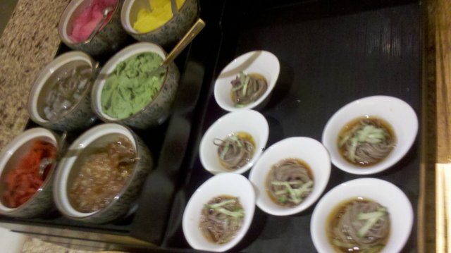 去过几次对于他们家的菜品上也算有发言权,从热菜到海鲜种类绝对不算多,海鲜什么的也都是速冻拿出来的,新鲜度也没有日料空运的那么新鲜,特别是有些贝壳类的都没有处理干净上面还有一些杂物,不过三文鱼、鲷鱼都还不错,在供应的量上感觉少了点人一多就必须要等,但是厨师在处理三文鱼的厚度上还是很慷慨的,厚厚的一片配着辛辣的芥末和香醇的日本酱油还是很肥美的,而且他们家的调料很多可以满足不同口味的人群。