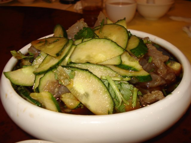 凉拌海蜇,海蜇相当爽脆,拌的酱汁有点酸甜的口感,再加上清爽的黄瓜片,很好吃哦。