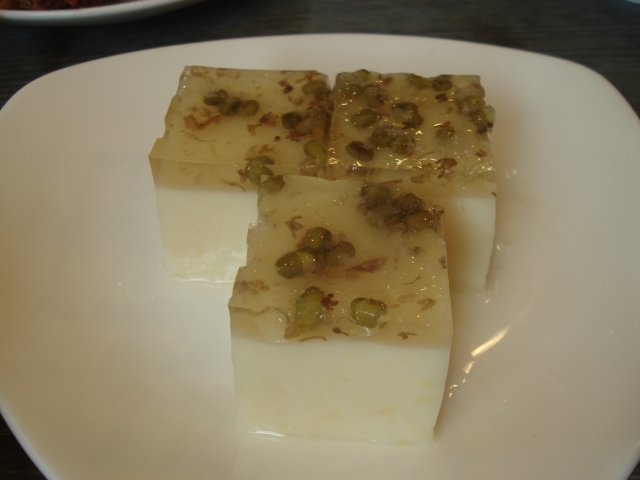 桂花绿豆糕,14元,端上桌一看,表层很晶莹剔透哦,下层雪白雪白的,外形上很漂亮,上面有一些规划和绿豆,下面是椰子糕的味道,软软的,不会很甜。