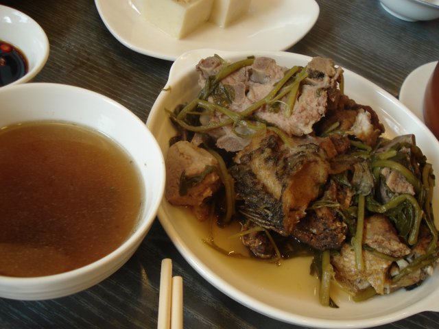 西洋菜生鱼陈肾汤,58元,来屋企汤馆嘛,汤总是要点一份的啦。一罐糖三四个人还蛮好,两个人的话是干不掉的。里头料蛮多的哦,店员把汤放在桌子旁边的架子上,帮你捞出里头的汤渣,再帮每人盛一碗汤。汤渣里头有不少鱼块,西洋菜,龙骨,还有些杏仁片,一个蜜枣,蘸着调料吃吃,老灵的说!老火靓汤的口感,自然没话说啦,很鲜,很清甜。