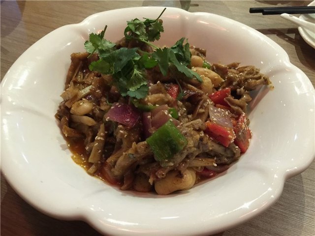 一个虎皮抓钱手,太辣。味道还不错。吃完了可以煮面。里面配的黄喉也还算是爽脆。