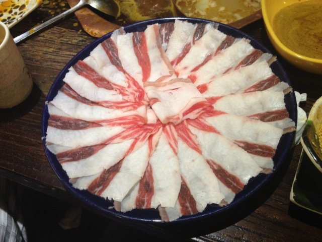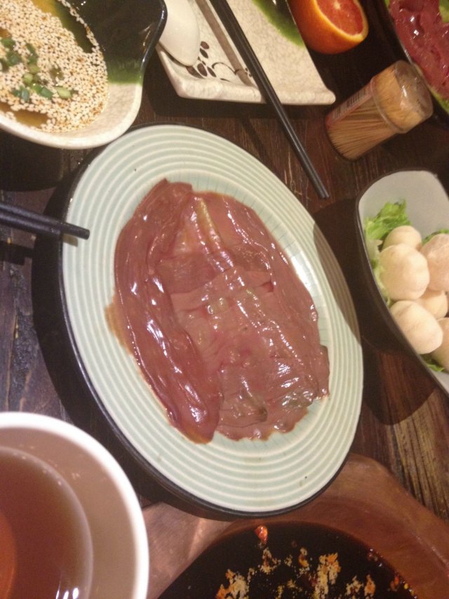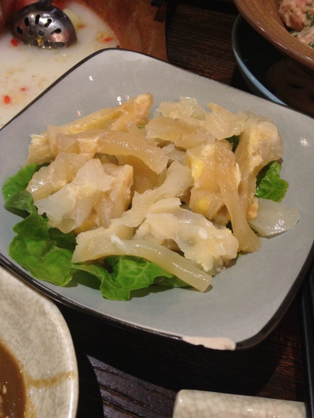 的确够肥,盘子里白色的部分占据了多半。和腰片一样,切的薄,肉偏少,下锅烫过立马变成袖珍型。