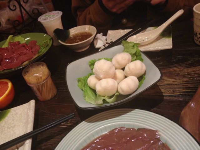这个其它火锅店不多见,相对有特色。在老店也算是招牌菜了。里面包裹着芝士,煮熟后咬破丸子外皮,里面的芝士就会呈现出来。